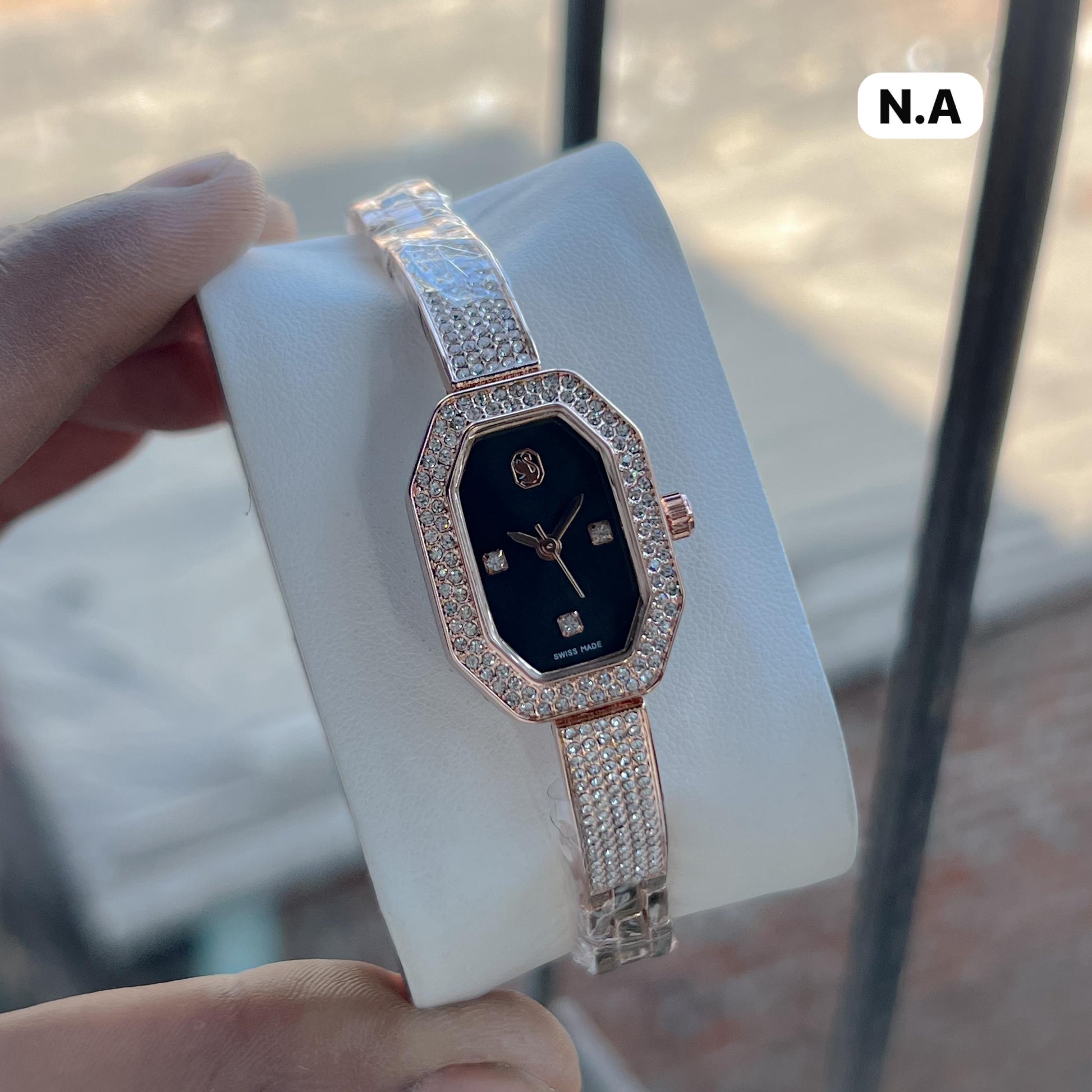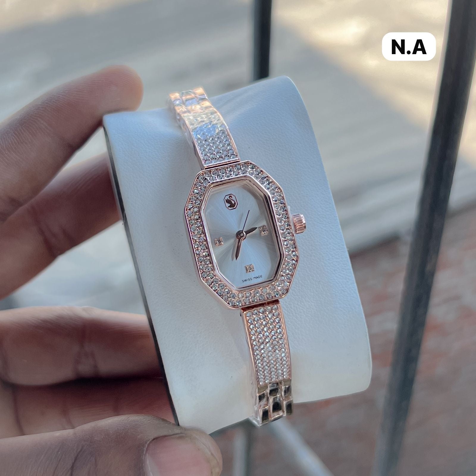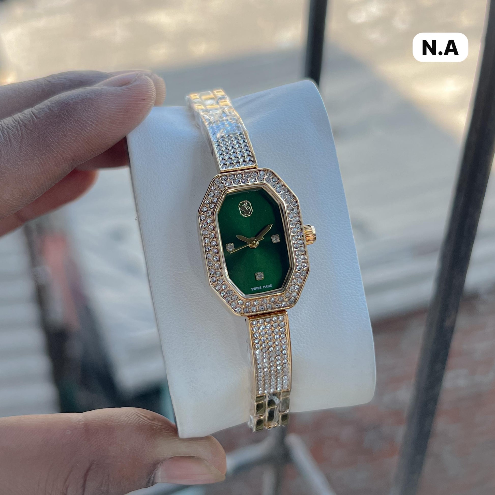 *Elegant Swarovski women’s watch featuring a rose gold body and a vibrant emerald- white dial. Adorned with sparkling crystal 😍*